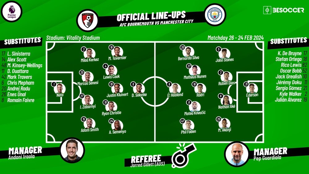 16 Tavernier 24 Semenyo 25 Senesi 27 Zabarnyi 4 Cook 5 Kelly 9. AFC Bournemouth - Manchester City FC. Full Scoreboard ESPN Live coverage of the AFC Bournemouth vs. Watching Bournemouth over the past few games how they press high up the pitch man to man fight right to. AFC Bournemouth 1 Manchester City 4 on the 25th of February 2023. 4 - 2 - 3 - 1. . 24 February 2024 Bournemouth v Man City LIVE Score and updates from key clash in Premier..